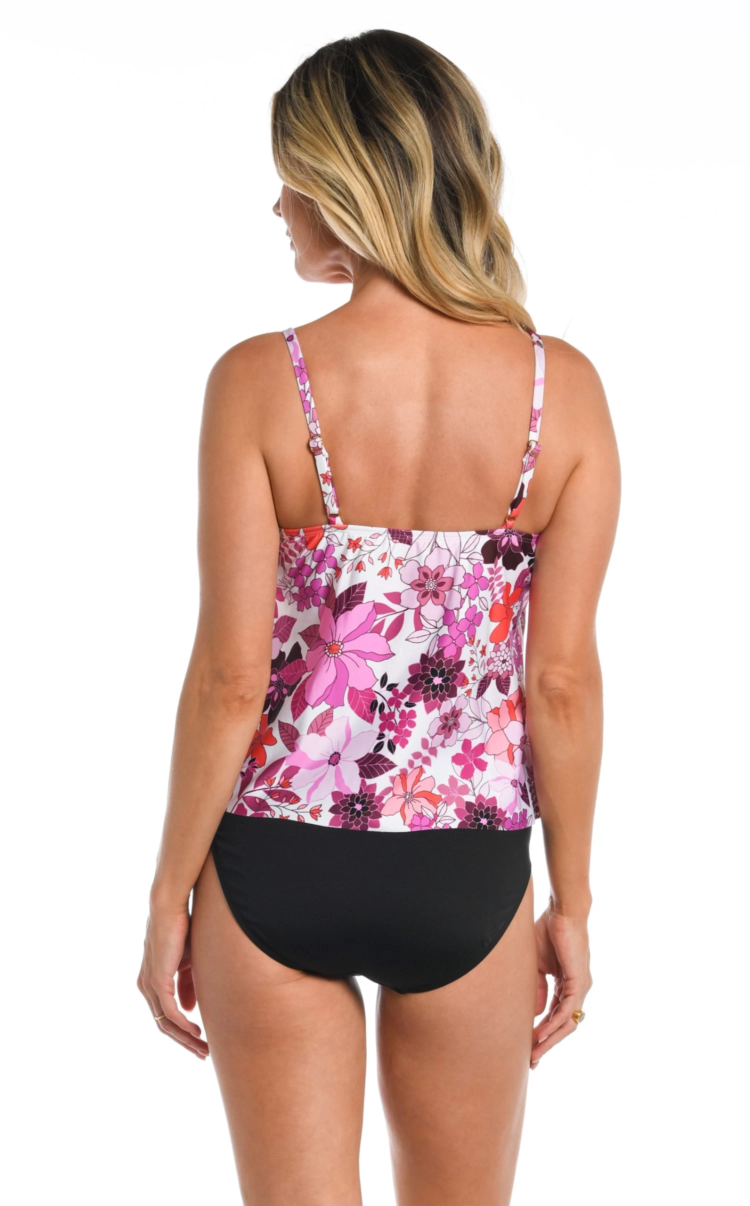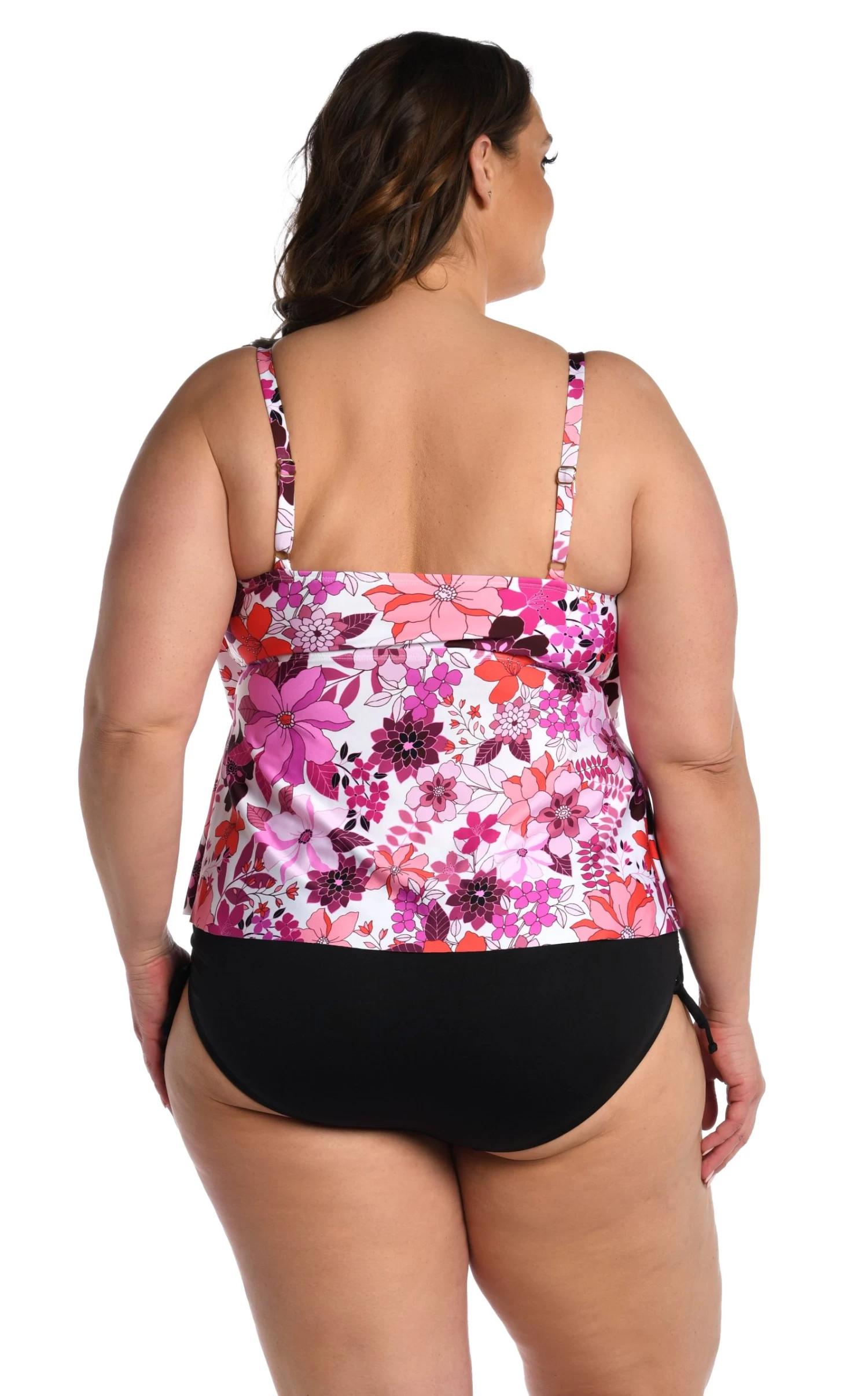 The Tiered Tankini with Gold Slider details in the print Tropic Blooms Multi is perfect for a summer day at the pool if you want to look feminine and cute. With the flowing tiered detail and gold slider on the straps, you can stand out from everyone else.