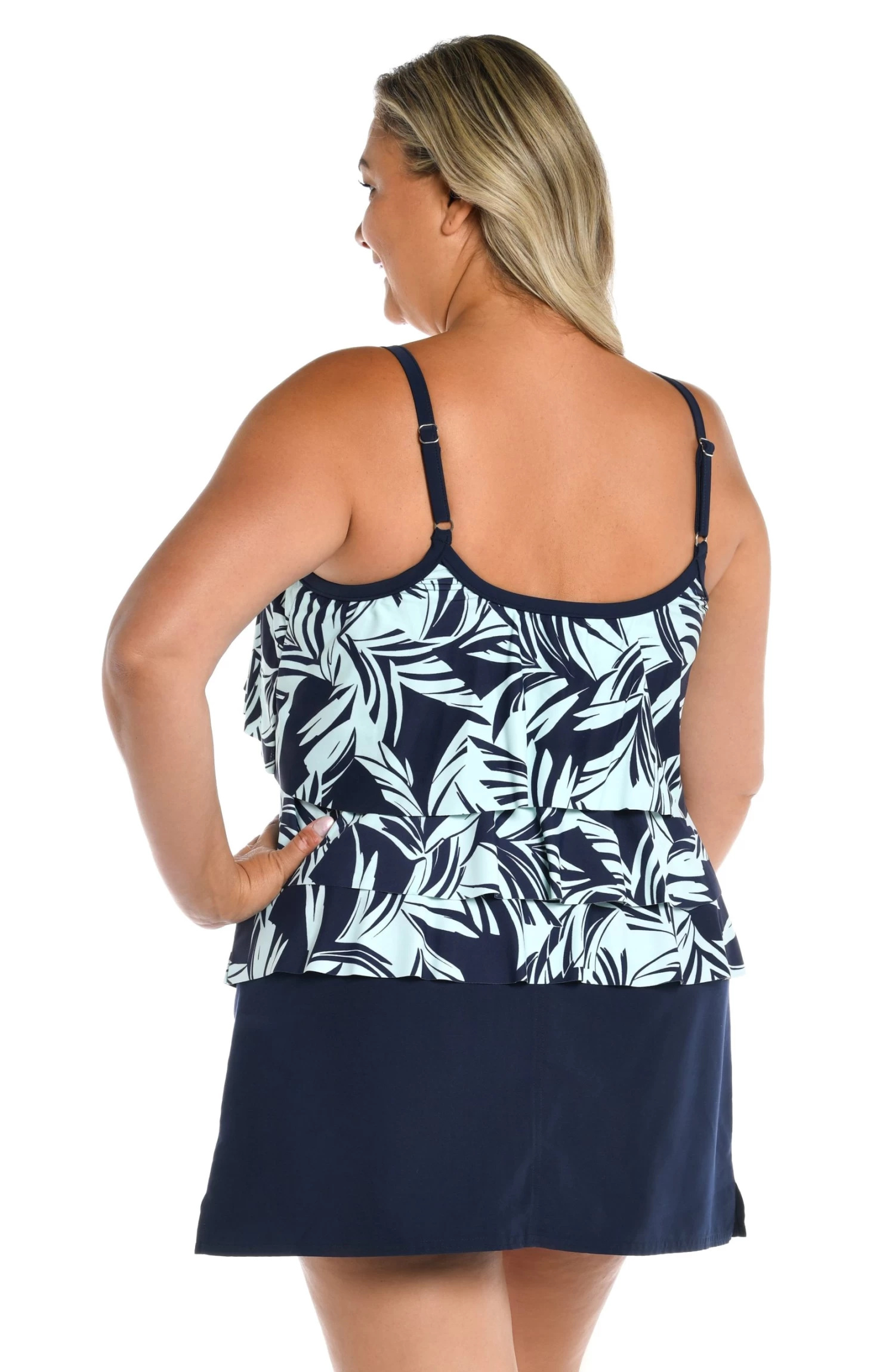 Palm fronds in a contrasting yet complementary blue hue offer a sophisticated update to the tropical-inspired print on this plus-size tankini. Ruffled layers create a loose, flowy fit that subtly disguises your stomach and waist, while a scoop neck and built-in cups flatter the bust.