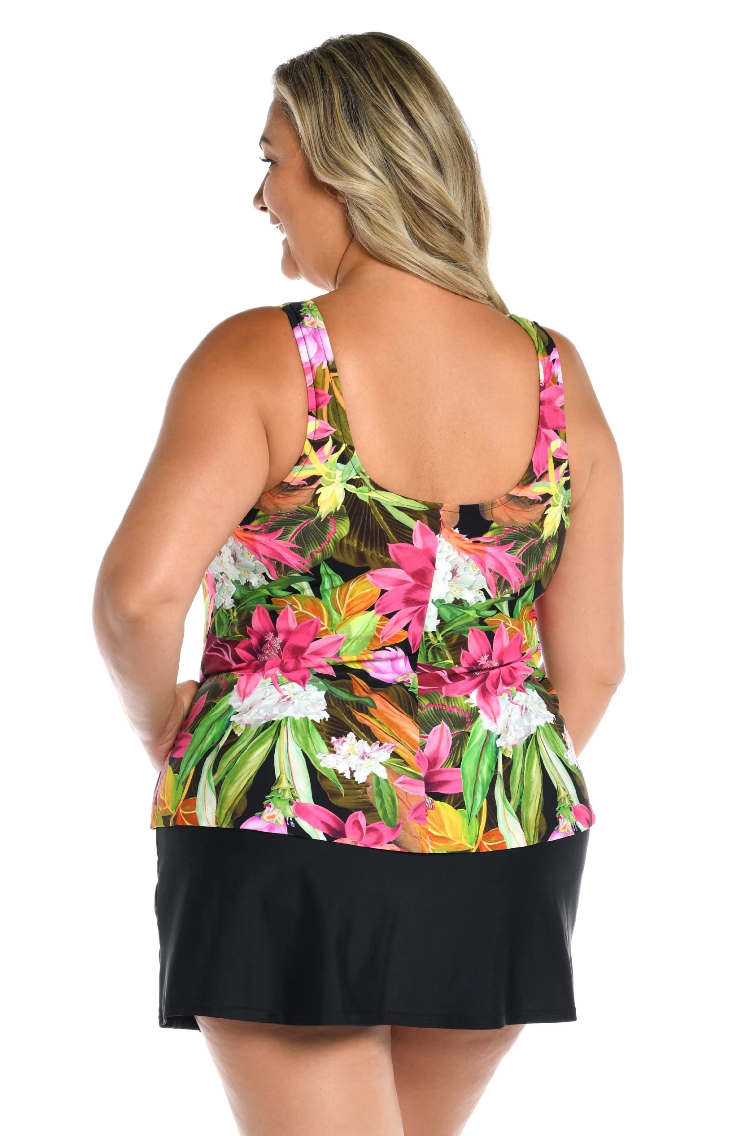 Show off your wild side in this plus-size tankini inspired by the flora and fauna of the Amazon Rainforest. Styled with a flattering scoop neck, this swim top features built-in cups and thick, over-the-shoulder straps that keep you comfortably supported.