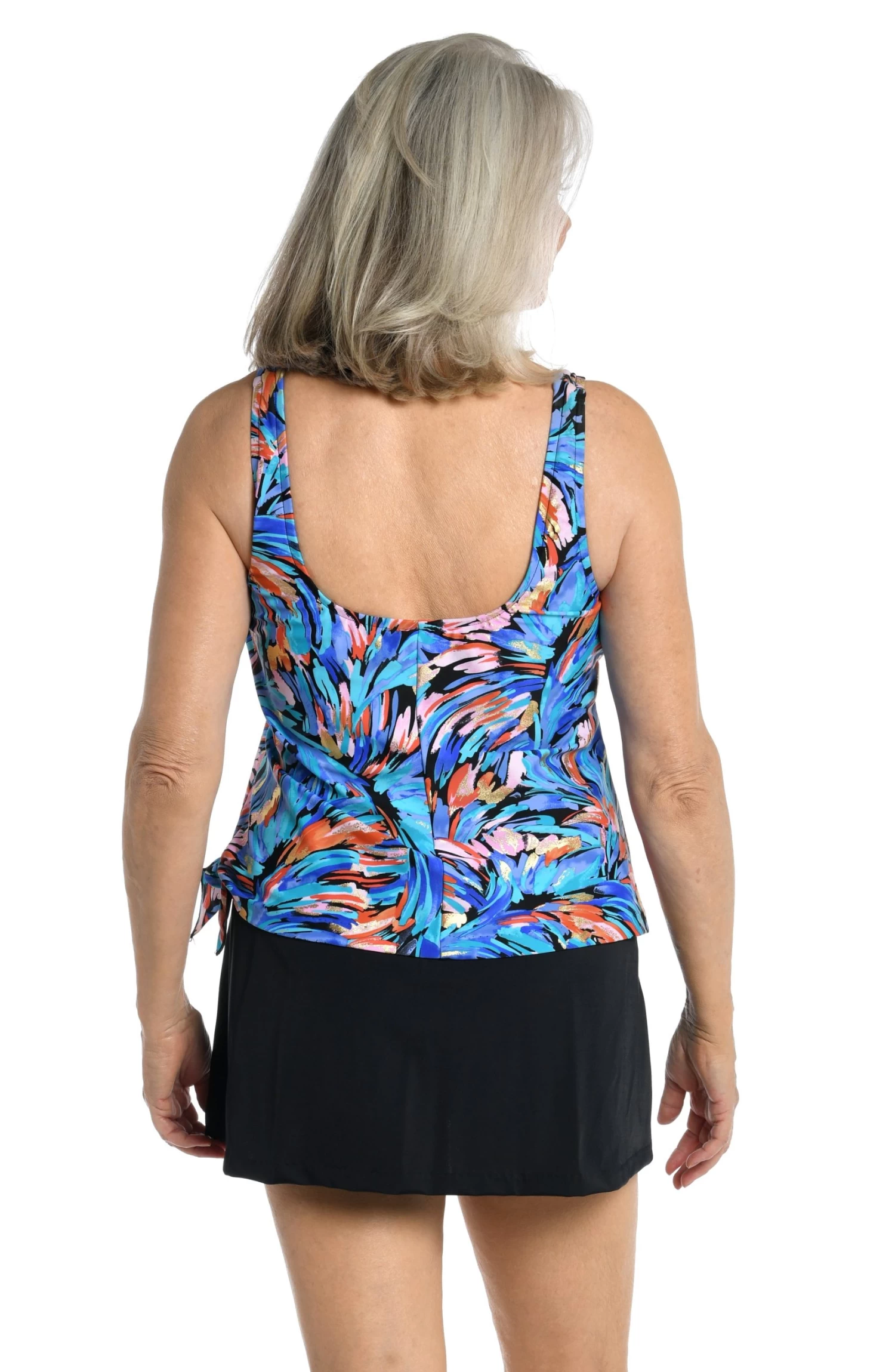 Ruffle some feathers with this swimsuit, rendered in gorgeous shades of blue, pink and coral. A side tie on the one-piece design creates the look of a tankini paired with a skirt. Built-in cups, in addition to tummy toner lift, support and smooth your silhouette.