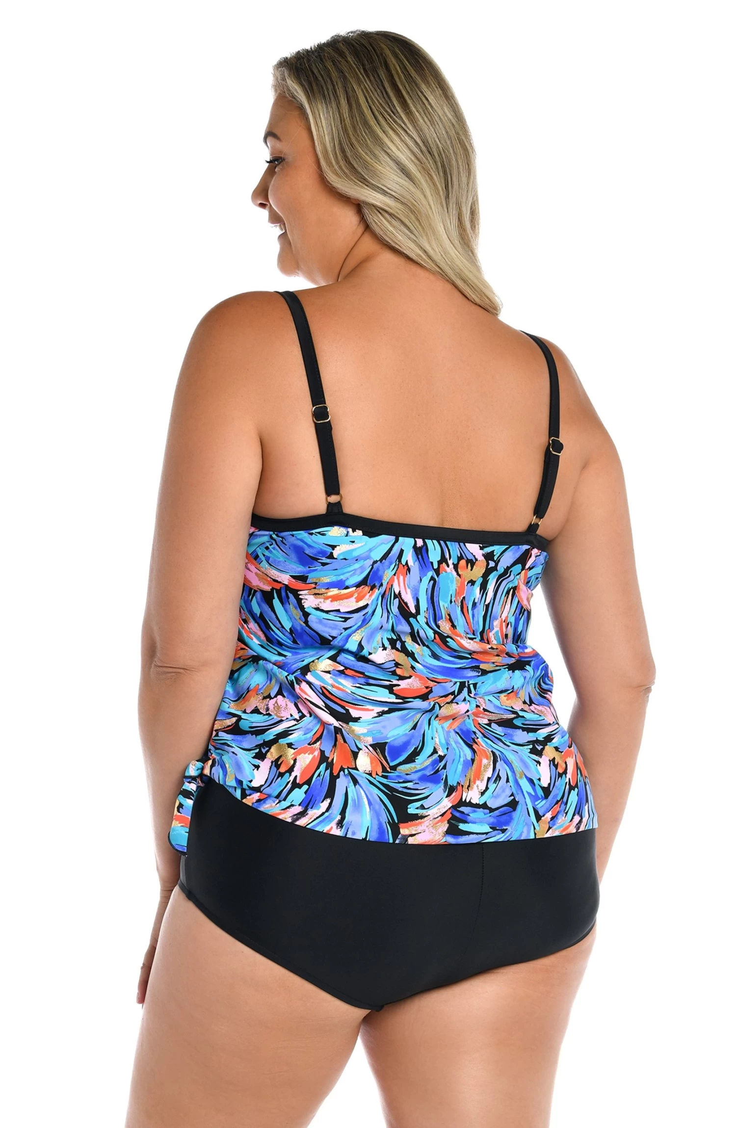 Ruffle some feathers with this plus-size one-piece suit, rendered in gorgeous shades of blue, pink and coral. The scoop-neck design with a side tie is cleverly crafted to look like a tankini and swim bottoms. Built-in cups, adjustable straps and a built-in tummy toner offer all the slimming support you’re looking for.
