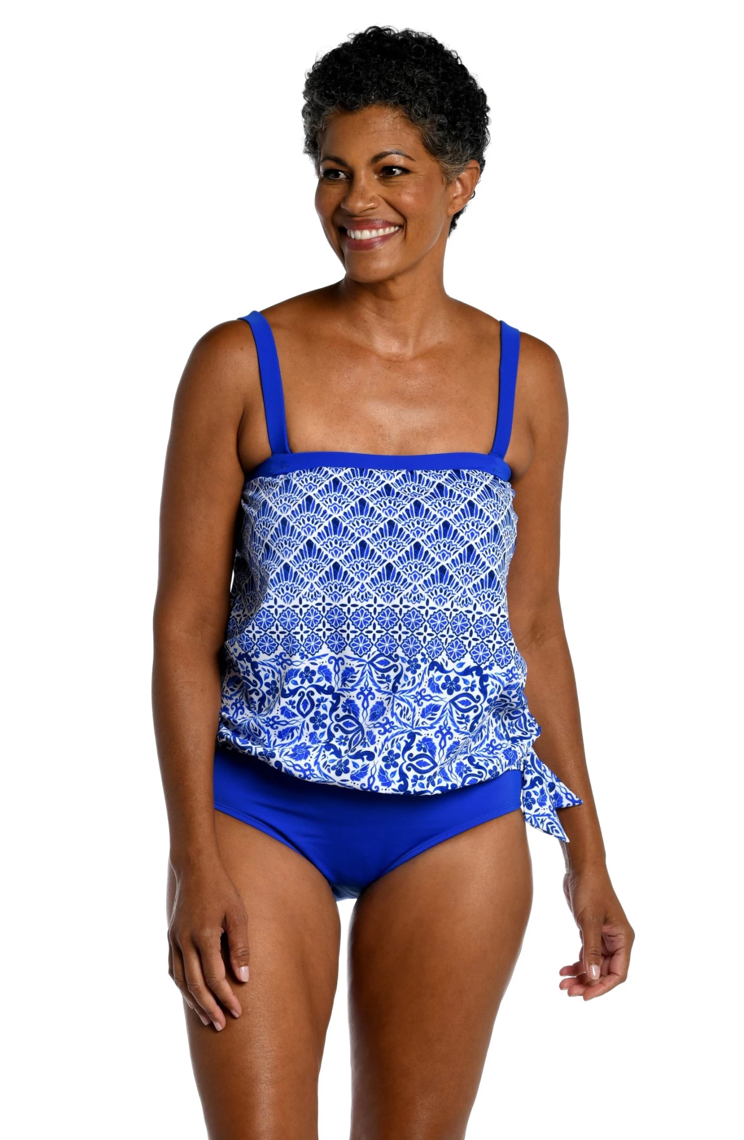 The tiled print in shades of Mediterranean blue on this tankini will instantly put you in a vacation state of mind. The loose-fitting blouson style is perfect for masking worry spots in the tummy area, while the side-tie detail adds a flirty touch. Remove the straps for a bandeau to eliminate those tan lines.
