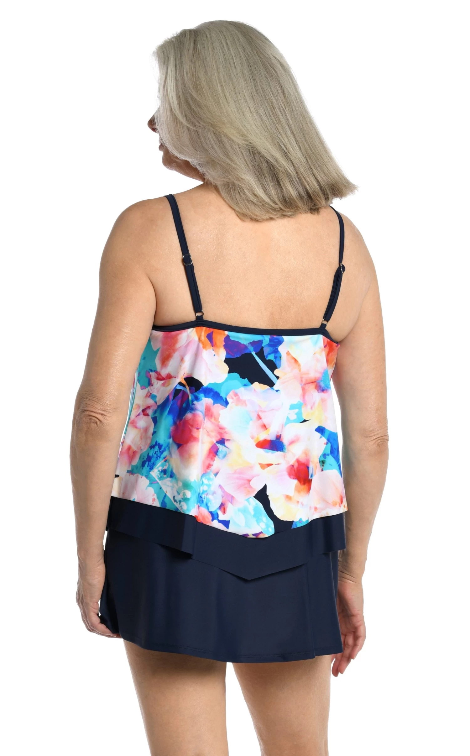 This tankini paints a pretty picture in a dreamy watercolor floral print. Built-in cups and adjustable straps provide comfortable lift and support. A feminine flutter hem allows you to show off your softer side for a confident fit.