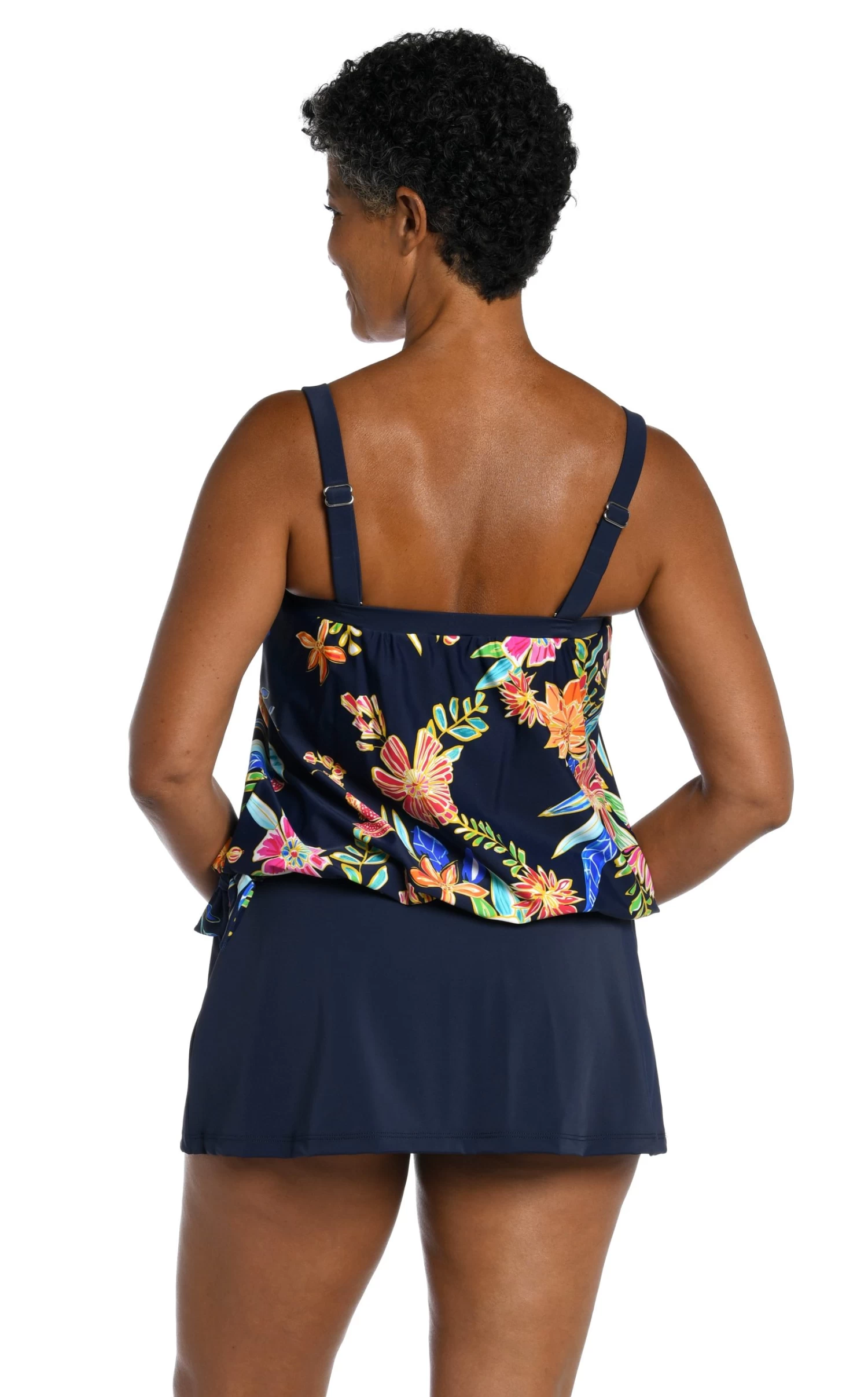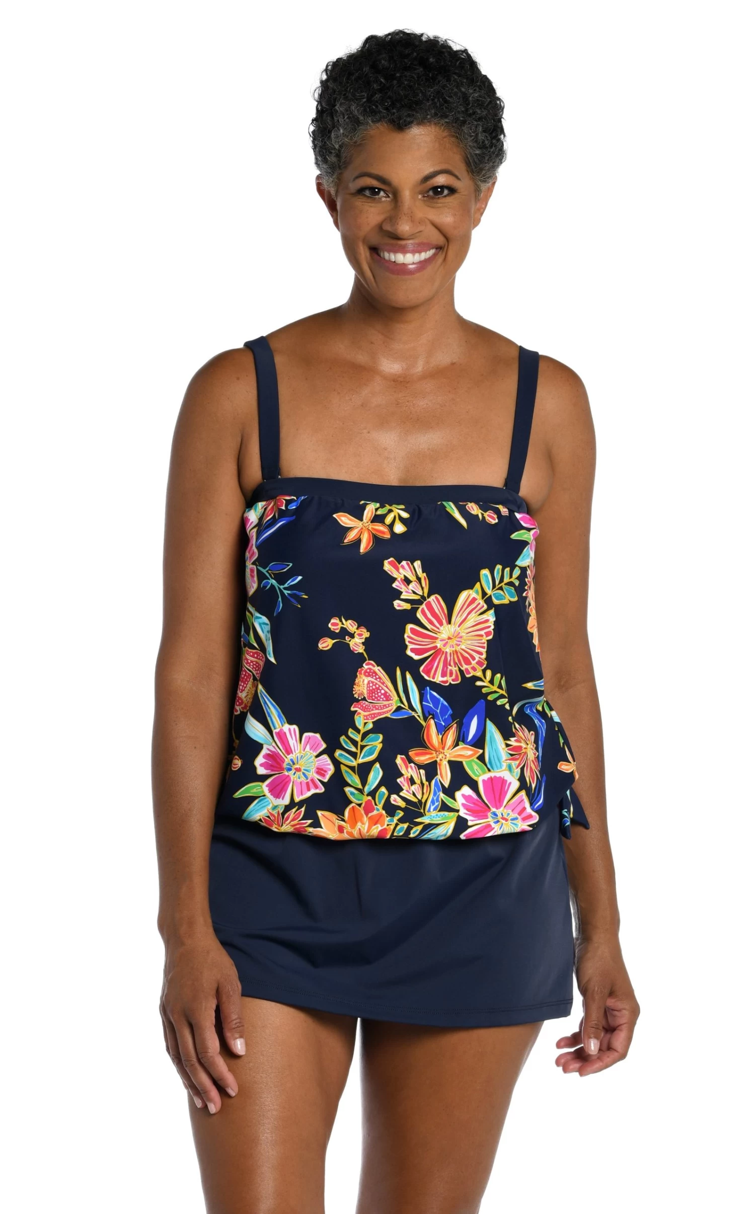 A garden’s worth of flowers in brilliant hues blooms against a canvas of indigo blue on this tankini. The loose-fitting blouson style is perfect for masking worry spots in the tummy area, while the side-tie detail adds a flirty touch. Remove the straps for a bandeau to eliminate those tan lines.