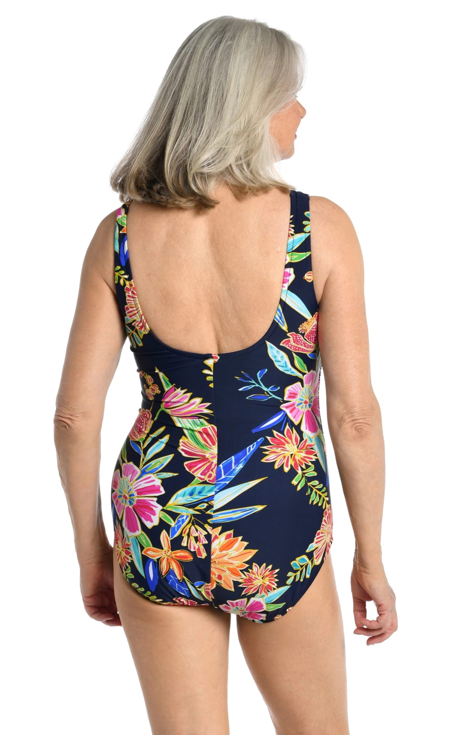 A garden’s worth of flowers in brilliant hues blooms against a canvas of navy blue on this one-piece suit. It’s styled with a subtle V-neck that accentuates the bust and side shirring that smooths and slims. Best of all, the girl-leg cut provides full coverage for a confident fit.