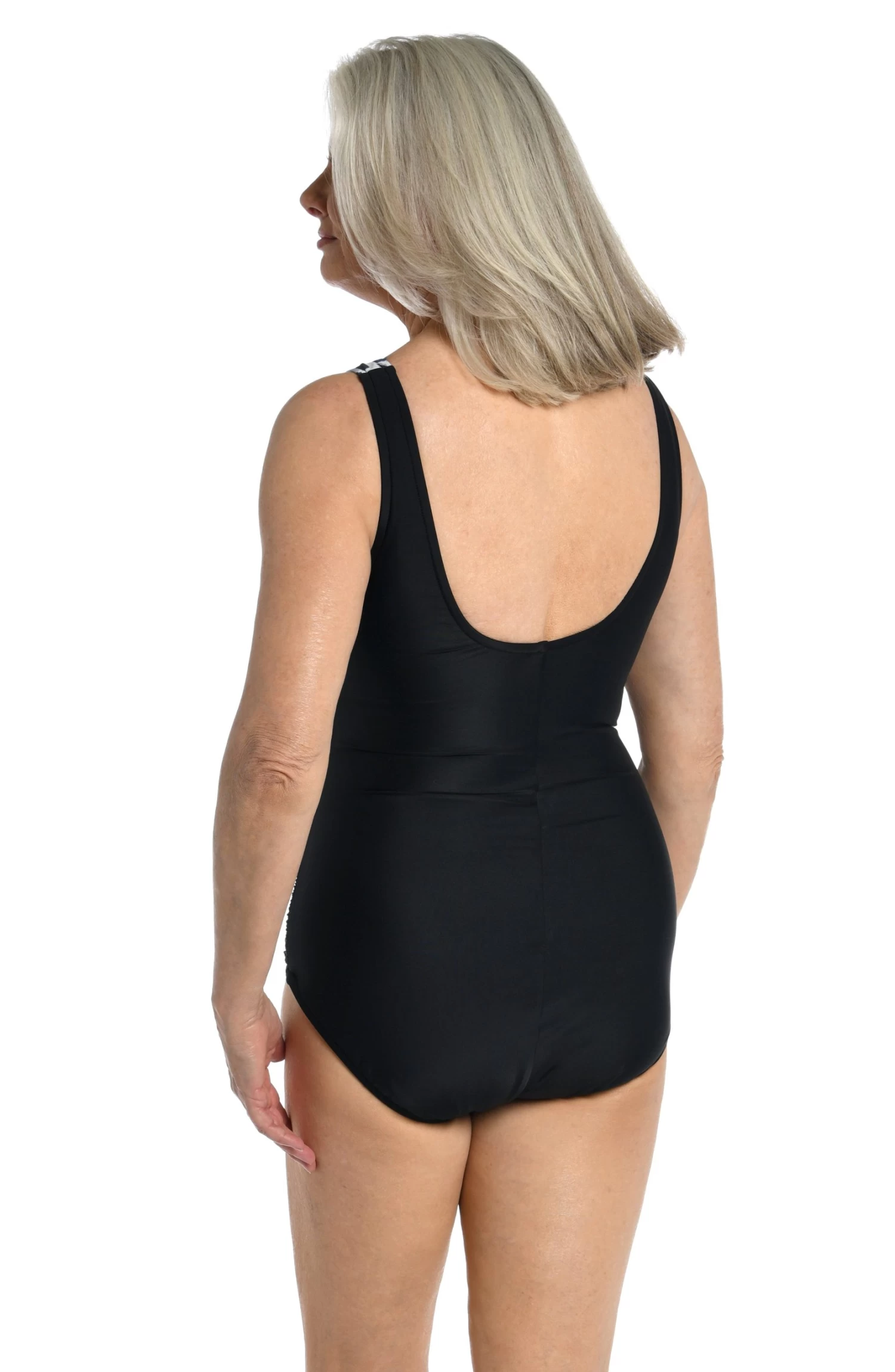 We’re wild about this one-piece swimsuit. The animal print up top fades into solid black for figure-defining style. Side shirring along with tummy control smooths and slims and the girl-leg cut provides full coverage for a confident fit. Part of the Maxine Movement collection, this suit delivers a higher level of chlorine resistance, shape retention and comfortable compression for a sleek silhouette.