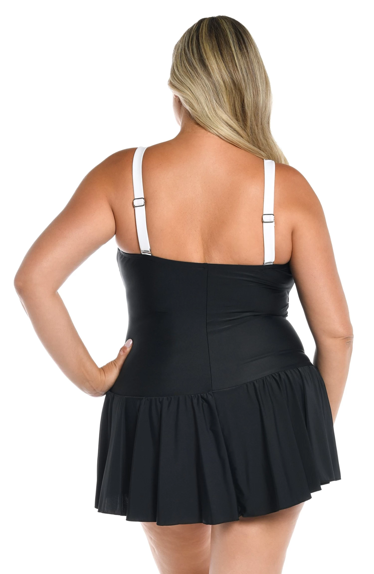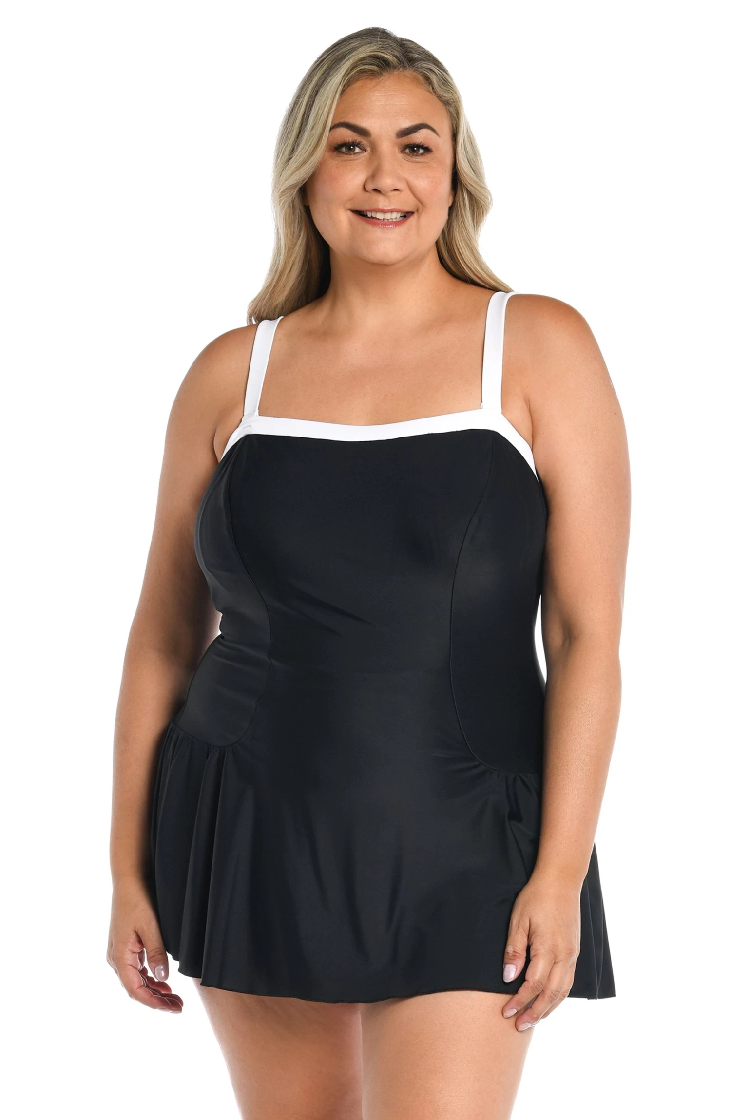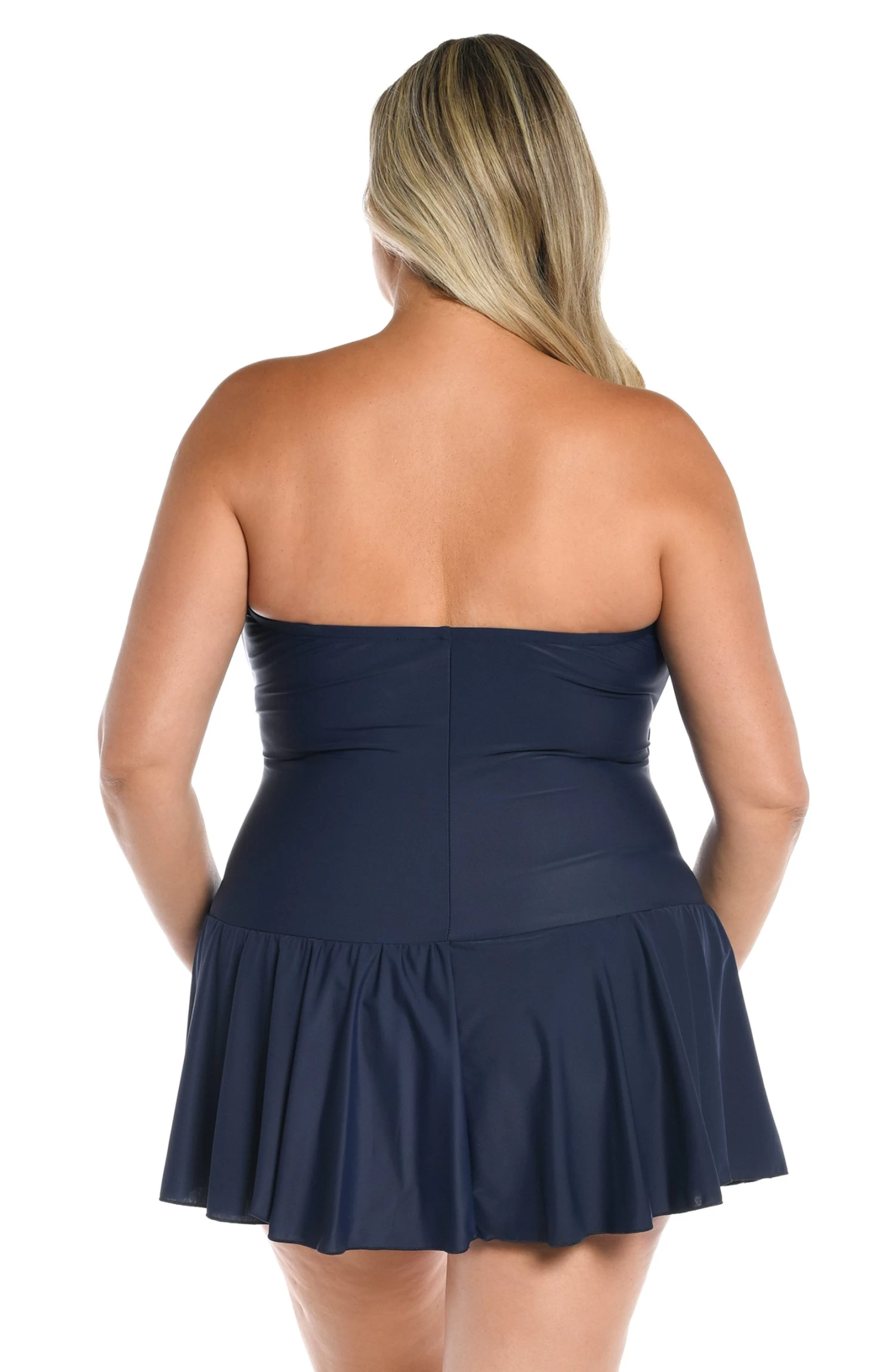 We love the classic look of a solid color swimsuit. It highlights and defines your silhouette in all the right ways. This plus-size bandeau swim dress with removable straps is styled with princess seams that skim and slim to give you an hourglass shape. The feminine skirt bottom provides full coverage front and back.