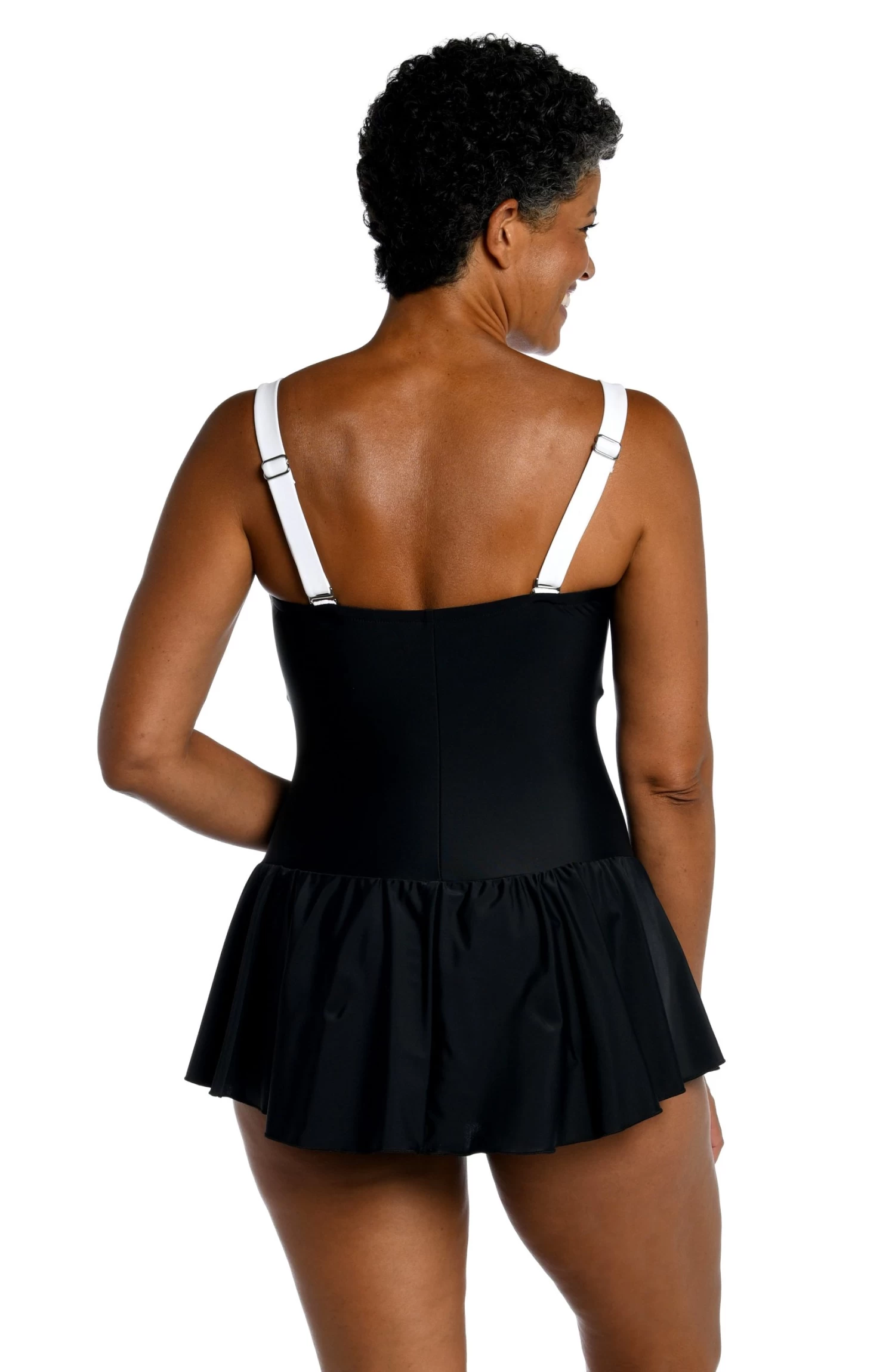 We love the classic look of a solid color swimsuit. It highlights and defines your silhouette in all the right ways. This bandeau swim dress with removable straps is styled with princess seams that skim and slim to give you an hourglass shape. The feminine skirt bottom provides full coverage front and back.