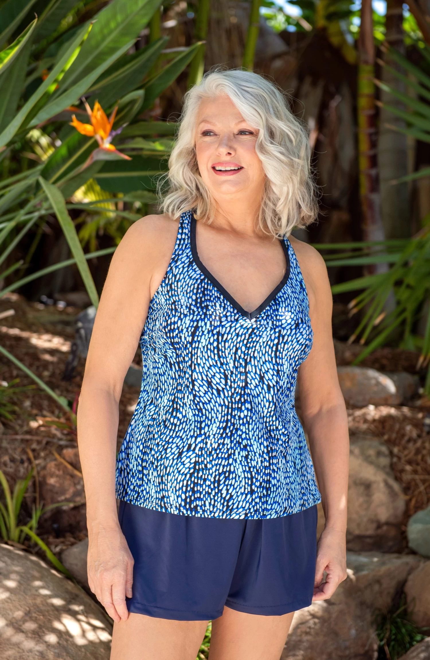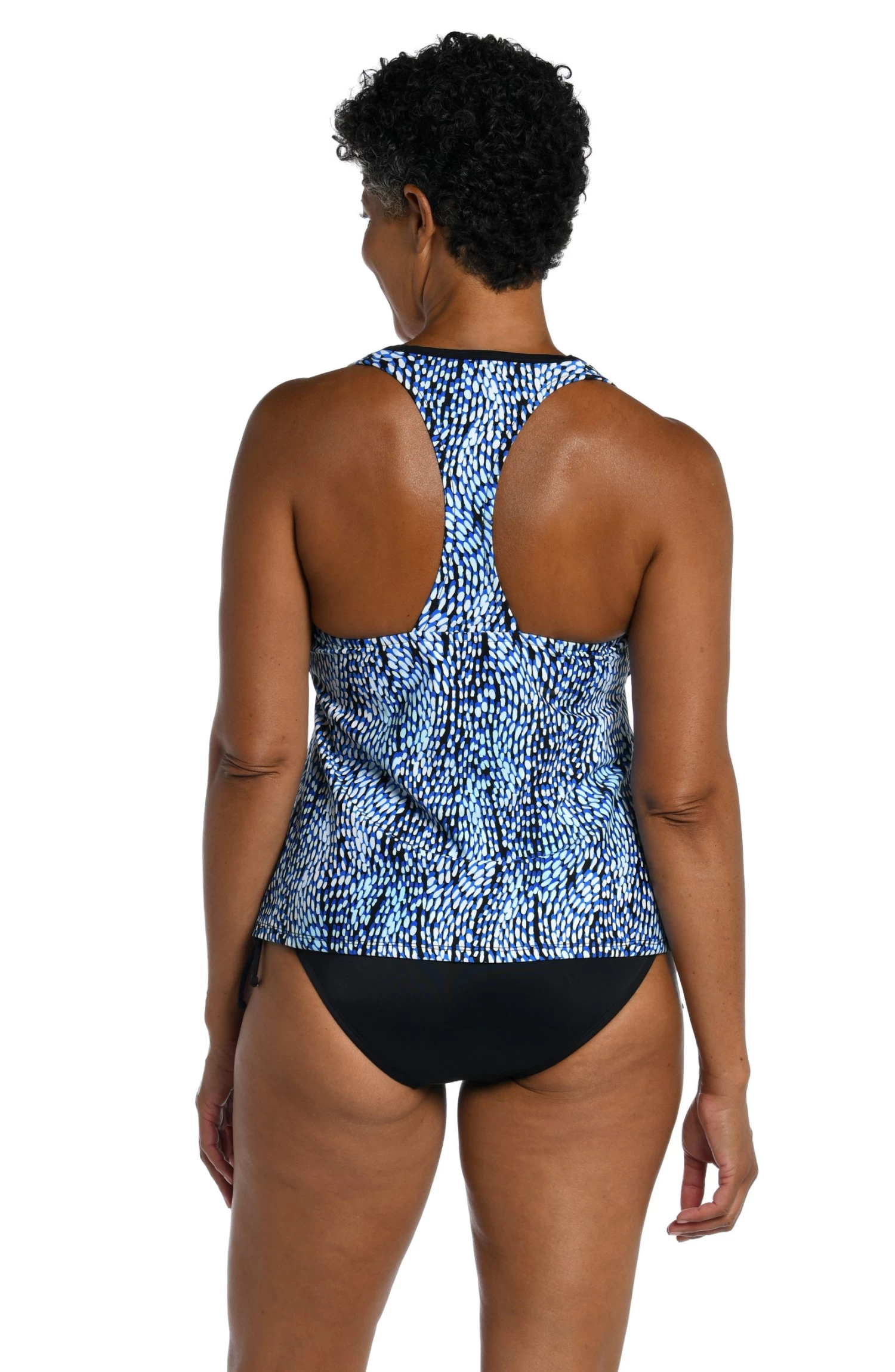This tankini features gorgeous swirls of blue with pops of white set against a black ground. Built-in cups keep you feeling lifted, while a sporty racer-back design shows off those shoulders.