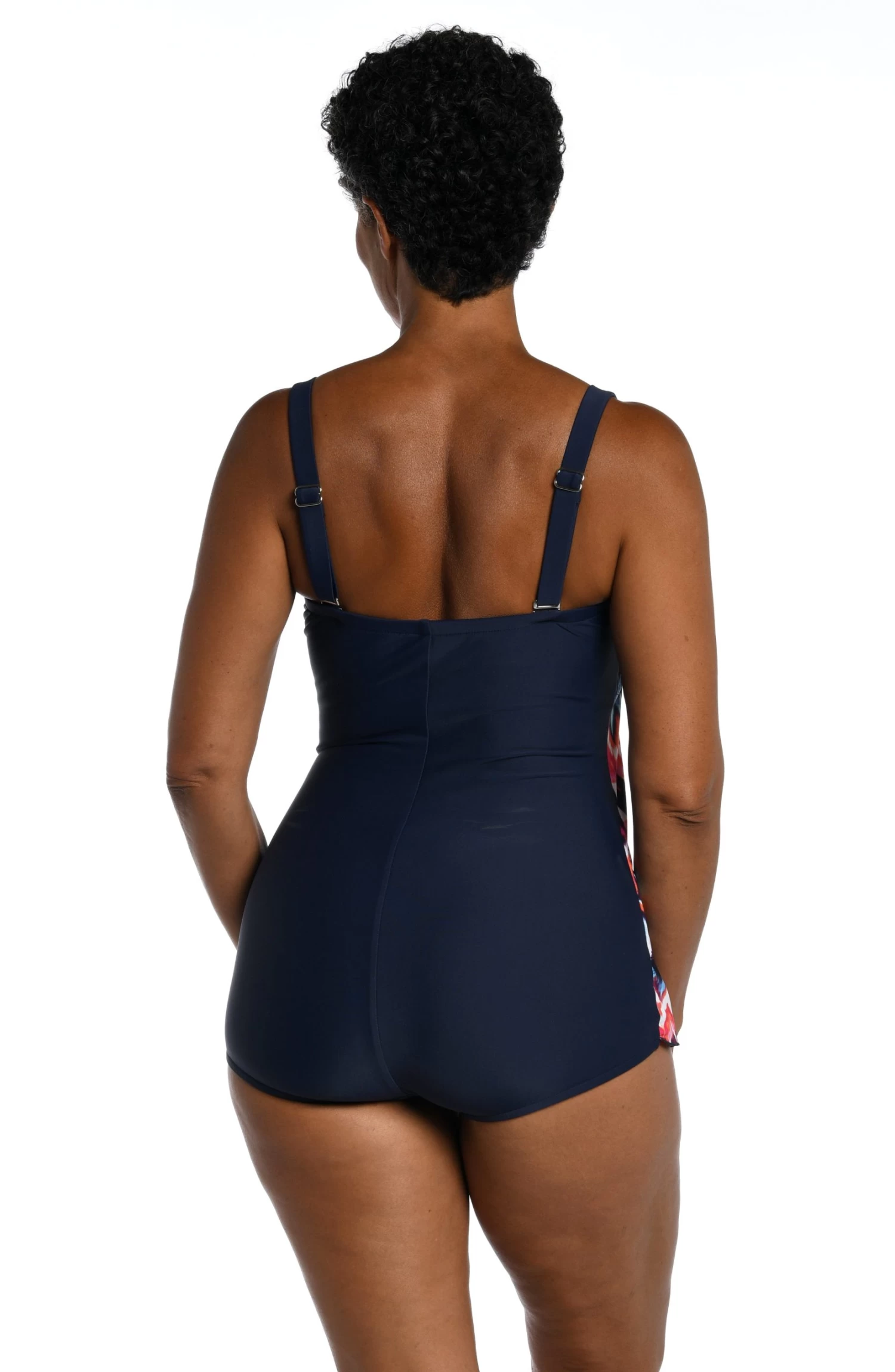 A heritage print reinterpreted in red, white and blue brings a touch of tradition to this one-piece swimsuit. With a longer length for full coverage all the way around, it features a side-tie detail for a flirty touch. Remove the straps to transition the suit into a bandeau and eliminate those tan lines in the process.