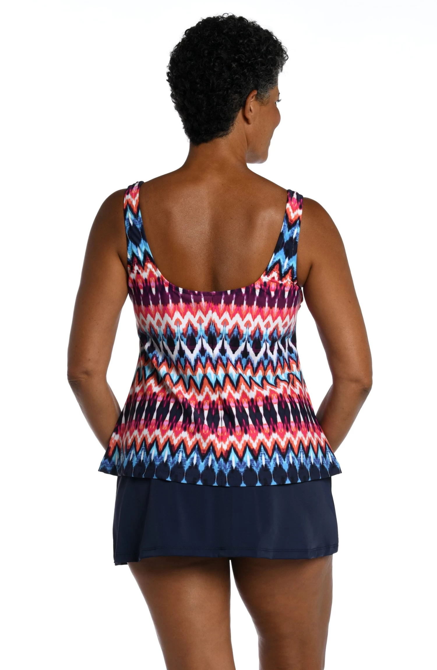 A heritage print reinterpreted in red, white and blue brings a touch of tradition to this tankini. Styled with a flattering scoop neck, this swim top features built-in cups and thick, over-the-shoulder straps that keep you comfortably supported.