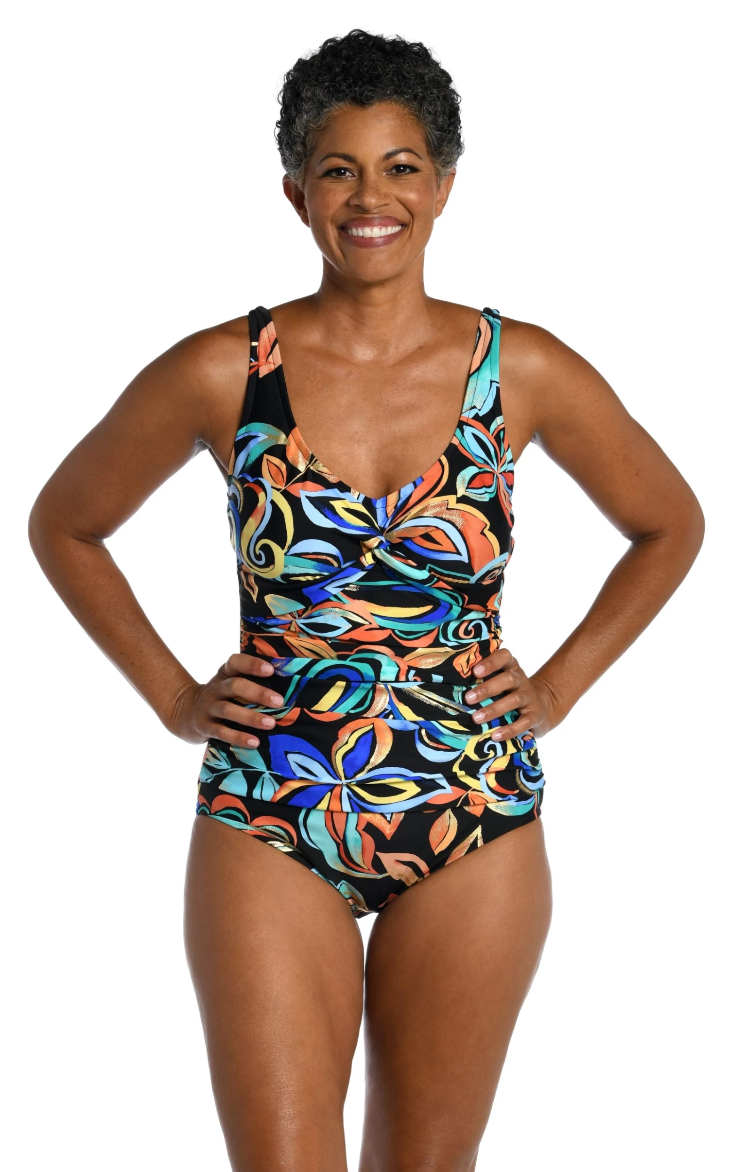 With the look of an artist’s hand, brushstroke shades of yellow, coral and blue create a painterly pattern on this one-piece suit. The twist-front V-neck accentuates the bustline while allover shirring and built-in tummy control neatly conceals worry areas.